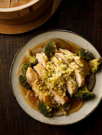まずご紹介したいのは、せいろで調理することでジューシーに、旨みや栄養素を逃さず旨みたっぷりに仕上がる「よだれ鶏」。じっくり蒸した鶏肉は驚くほどしっとりと、ジューシーに仕上がる。砂糖と塩で下ごしらえすることで、長ねぎとにんにくが香る“特製ダレ”がよく沁みる絶品だ。