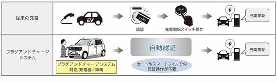 大きな特徴は、急速充電を可能とする「チャデモ(CHAdeMO)規格」に準拠したものとしては日本初となる「プラグアンドチャージシステム」を採用すること。BEVに充電プラグを差し込むと自動でユーザーを認証し、充電を開始するシステムだ。従来の認証用カードやスマートフォンによるユーザー認証、充電開始のボタン操作などが不要になることで、ユーザーの手間を省き、充電時間の短縮につながるという。