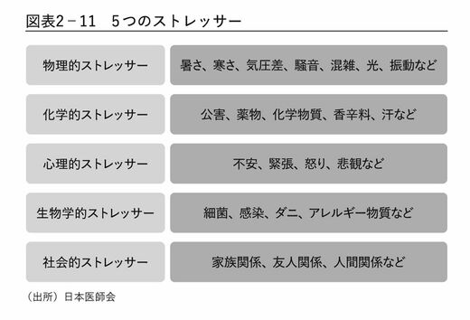 そこで、日ごろからストレッサーを抑えておくことが大切なのだ。ちなみに著者によれば、ストレッサーは下記の5つに分類されるという。