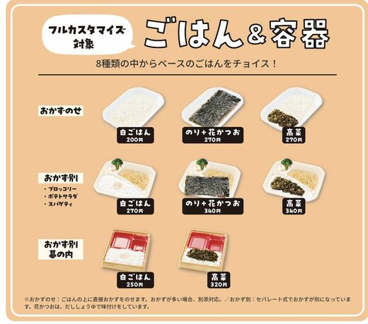 この方式だと、「おかずを上に載せる」のか「おかずを別にするのか」というところから自分で選んでいく。