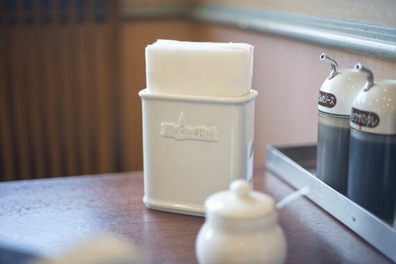 ナプキン入れが陶器でできていることに気が付いた。しっかりとロゴが入っており凝っている。