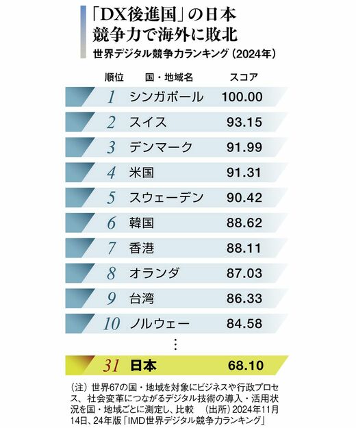 IMD世界競争力センターの分析では、日本のデジタル競争力は世界で31位。同調査で日本は、「デジタル/技術的スキル」が最下位の67位だった。25年の崖は、過去の話ではなく、現在進行形の問題なのだ。