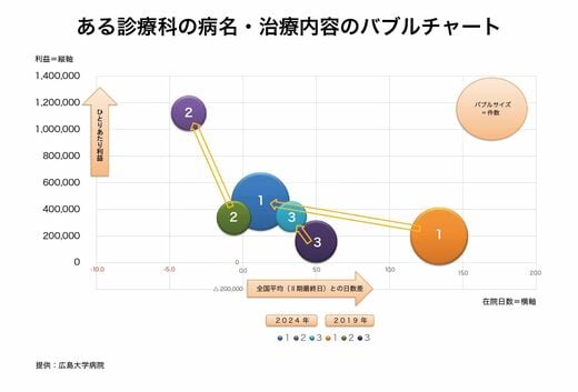 これを診療科ごとに、全国平均と比較したときの在院日数の差を横軸、1人あたりの利益を縦軸にして、患者数を円の大きさで示すバブルチャートを使って収支状況を可視化している(図)。
