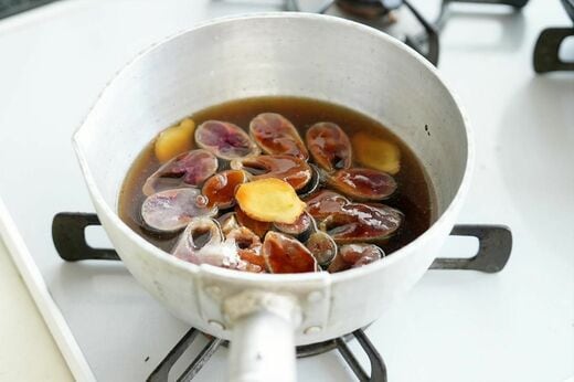 このとき、お腹を開いてしまうときれいな形に煮えないので、注意が必要です。鍋にサンマを並べ、適当な厚さに切ったショウガ、調味料を加えていきます。