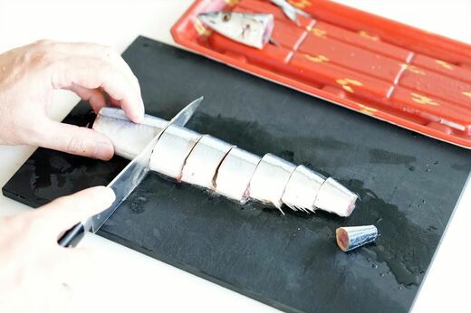 頭と尾を落とし、骨ごとぶつ切りにしていきます。内臓をつけたまま煮ていきますが、苦手な方は割りばしなどで取り除きましょう。