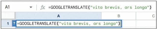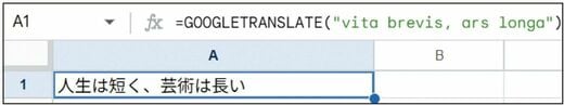 これで関数名が入力され、続けて「(」が表示されます。ここで、文章や言語を指定しますが、和訳なら簡単。つまり、スプレッドシートを日本語で使用しているなら(厳密にはシステム言語が日本語なら)、他国語の文章を入力するだけでよいのです。このとき、他国語の種類は自動で判定され、日本語への翻訳が実行されます。