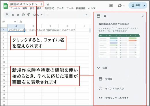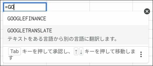 さっそく、翻訳結果を表示したいセルに「=GO」(いずれも半角)と入力してみましょう。関数名の候補が表示されるので、「GOOGLETRANSLATE」を選びます。