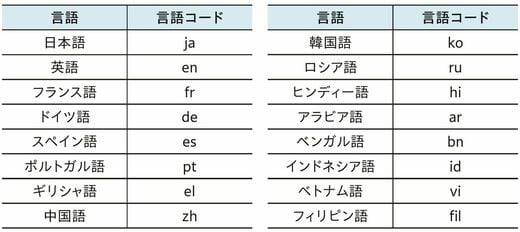 1つ目の「テキスト」には、翻訳したい文章などを入れます。2つ目の「ソース言語」では翻訳前の言語、3つ目の「ターゲット言語」では翻訳後の言語を指定します。具体的には、次の表のような言語コードを入れます。3つとも、数式の中で直接打ち込む場合は前後を「"」で囲みます(他のセルを参照させる場合は不要です)。