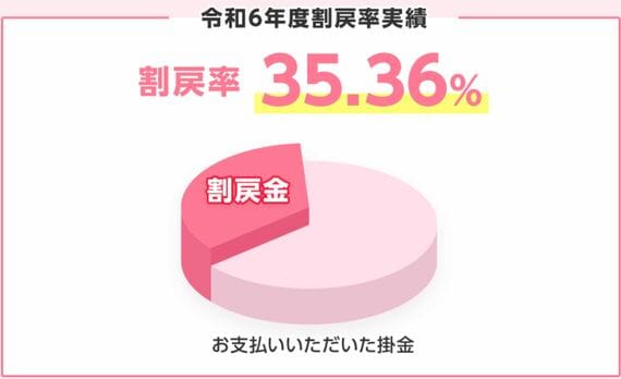 もう1つ注目したいのが、「割戻金」が戻ってくるという都道府県民共済の大きな特長だ。「割戻金」とは、都道府県民共済が行う毎年の決算で、剰余金が生じたときに加入者へ戻すしくみのこと。例えば「総合保障2型」の2024(令和6)年度の割戻率は全国平均で35.36%。年間の掛金の3割以上が戻ってきた計算になる(※4)。