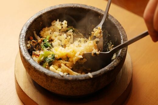 石焼ビビンバは青のりのようなものが入っていて、磯の風味があるのが面白い。一般的に濃い味付けのものも多いが、こちらの石焼ビビンバはあっさり目で、いわば和風だ。量も茶碗1杯ぐらいと軽め。