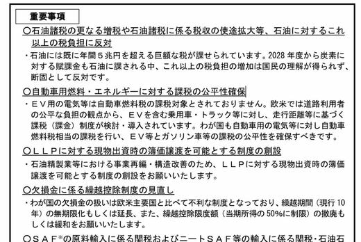 石油連盟は併せて、旧暫定税率の廃止を求めており、自動車用の電気などにも自動車燃料税相当の課税を行い、EVやガソリン車にかかわらず課税の公平性を確保すべきとしている。確かに、ガソリン車だけに負担が偏っている現状を改善する意図には一定の合理性がある。