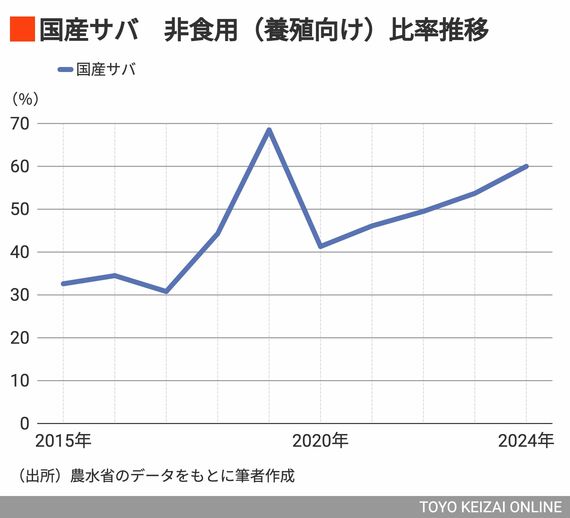 一般には「国産サバが減ったからノルウェー産に依存している」と説明されますが、実際には相当量のサバが養殖用エサに回されており、これは見過ごされがちな“巨大なロス”です。その結果、食用に回せる魚が不足し、社会全体でサバが足りない状況を招いています。しかもこの比率は改善するどころか年々高まっており、問題は悪化しています。