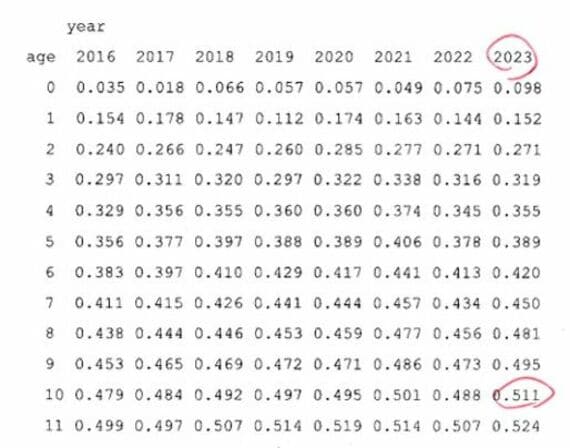 次のデータはタイセイヨウサバ(ノルウェーサバ)の年齢と重量の関係を表しています。赤丸のところを見ていただくと、500グラムになるのにおおよそ10年かかっていることがわかります。