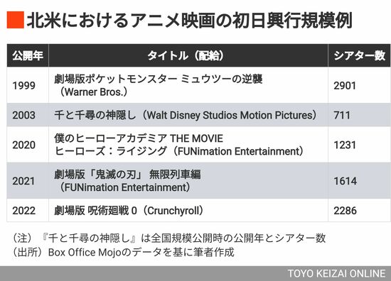 これまで北米の興収記録を保持していた『ミュウツーの逆襲』は3000館近い上映規模ですが、基本的にはメジャータイトルの半分以下のシアター数です。アカデミー賞で長編アニメ映画賞を受賞した『千と千尋の神隠し』でさえ、これほどの上映規模であったことには驚きでした。