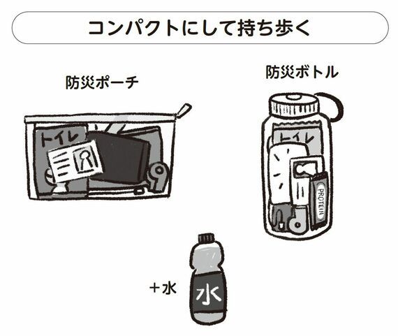 プラスチックのボトルに詰めて「防災ボトル」として持ち歩く人もいます。女性スタッフの防災ポーチは、友人から「軽い!」と驚かれるそうです。彼女は私が挙げたもの以外に、免許証のコピーや、万一スマホが使えなくなった場合に備えて家族の連絡先を書いたメモ、常備薬なども入れているそうです。
