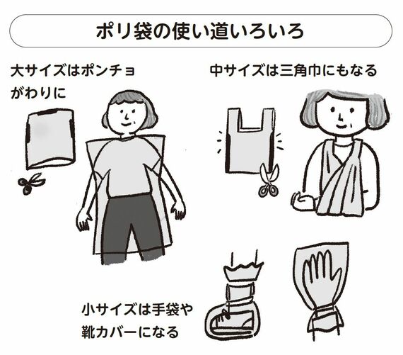 ⑦ポリ袋も、使い道はいろいろです。大(90l、子どもなら45l)は、ポンチョのように防寒・防水に使えます。中(レジ袋の大きさ)は、バッグなどを雨から守ったり、濡れた物を入れたりできます。腕を怪我したときに、三角巾のように使うこともできます。