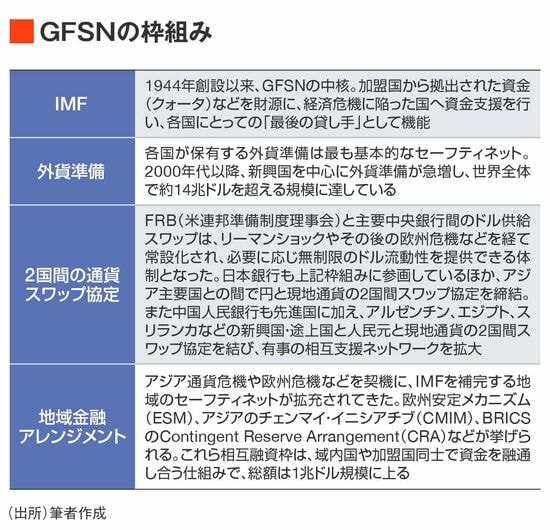 GFSNとは、国際的な金融システムの安定を維持するための一連の仕組みや制度を指し、国際通貨基金(IMF)の融資枠、2国間の通貨スワップ協定、地域の金融協定(地域金融アレンジメント)、そして各国の外貨準備、といったさまざまな層からなる安全網のことだ。