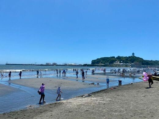 1931(昭和6)年、小田急線江ノ島線にて海水浴客用の直通電車の運行が開始されたことで、海水浴客が激増した。片瀬海岸は夏の行楽地として地位を確立。明治時代から一部の別荘人に楽しまれていた海水浴は、昭和初期に大衆の娯楽として広がっていった。
