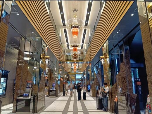 入り口の自動扉を入った瞬間、「あ、すみません。入るホテルを間違えました」と方向転換しそうになるほど、ロビーの造りは豪華絢爛。天井からはシャンデリアが5個以上ぶら下がっており、インフォーメーション用の看板には「1F カフェ&バー」「2F バー&レストラン」「4F セブン–イレブン」「40F スカイプール」など、アパっぽくない情報で溢れている。