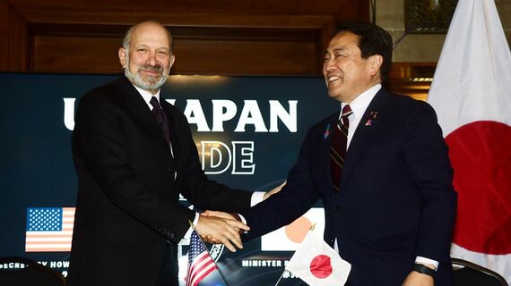 対米直接投資に関する覚書の署名式で握手する赤沢亮正経済再生担当相とラトニック米商務長官 (写真:時事)