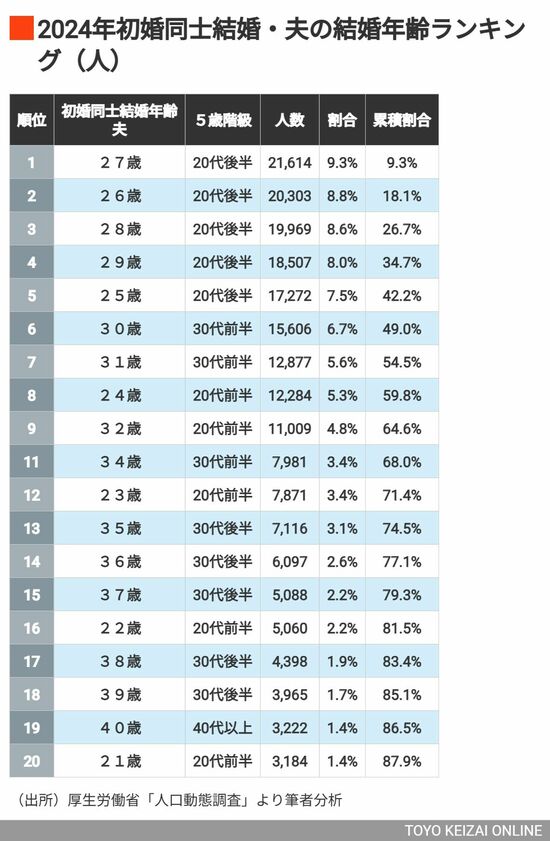 「男性の結婚ピーク年齢が27歳」と聞いてびっくりした読者もいるかもしれませんが、2024年統計からさかのぼること20年前の2004年統計でみると、初婚同士結婚の男性のピーク年齢は28歳で、27歳、29歳、26歳と続きます。