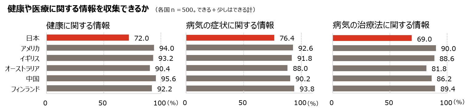 「健康や医療に関する情報を収集できるか」という点で他国と比べ、日本は一段階、自己評価が低い(出所:「人生100年時代 × デジタル社会の総合的なヘルスリテラシー国際調査」ニュースリリースより抜粋)