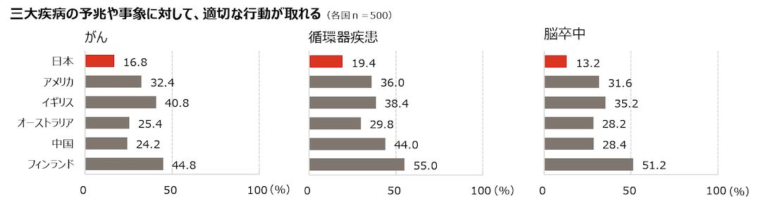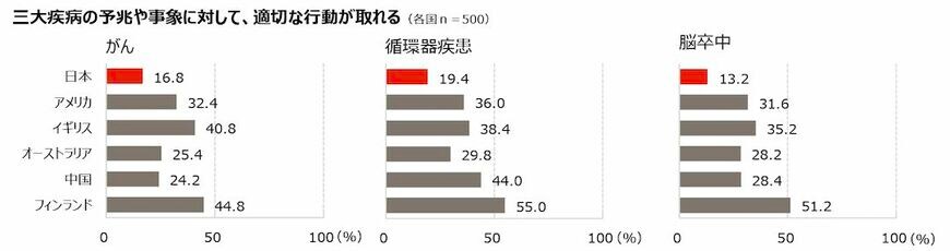 「三大疾病の予兆や事象に対して、適切な行動が取れる」という点でもワーストになってしまった日本。(出所:「人生100年時代 × デジタル社会の総合的なヘルスリテラシー国際調査」)