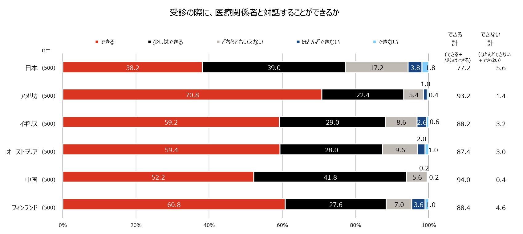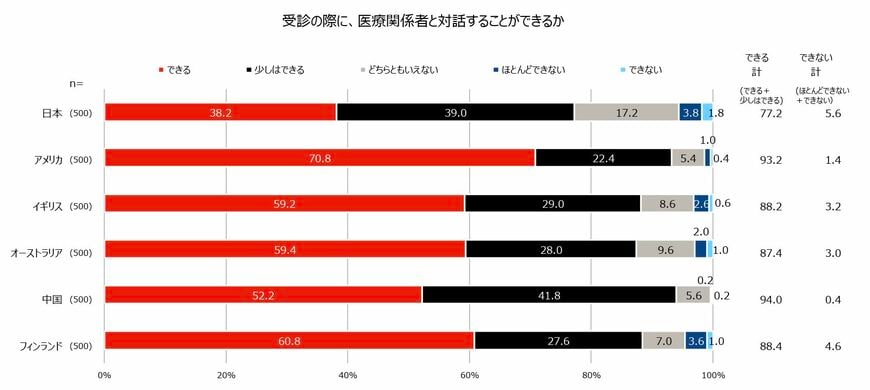 「あなたは、診察を受ける際に医療関係者(医師、看護師、薬剤師など)と対話することができますか?」の調査結果。リテラシーを高めることで、積極的な対話も可能になる(出所:「人生100年時代 × デジタル社会の総合的なヘルスリテラシー国際調査」)