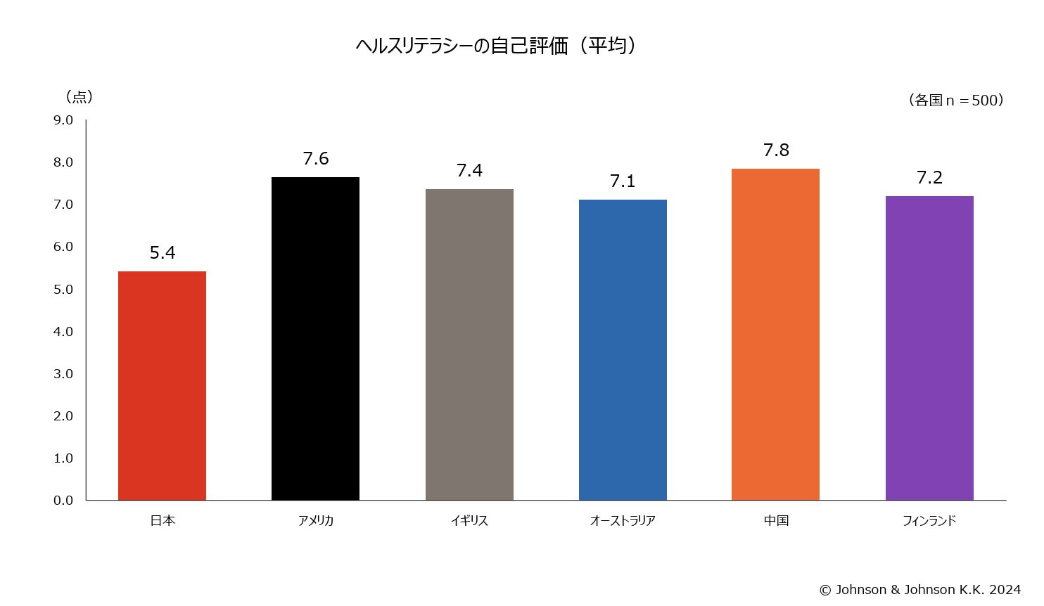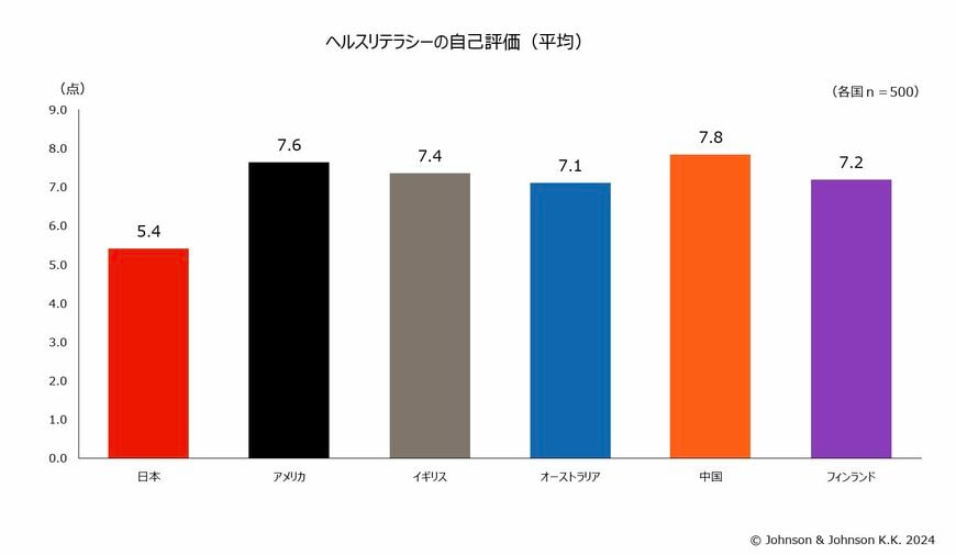 当社が実施した国際調査「人生100年時代 × デジタル社会の総合的なヘルスリテラシー国際調査」では、 残念ながら日本のヘルスリテラシーの自己評価は6カ国(日本、アメリカ、イギリス、オーストラリア、中国、フィンランド)中、最も低いという結果が出ています。