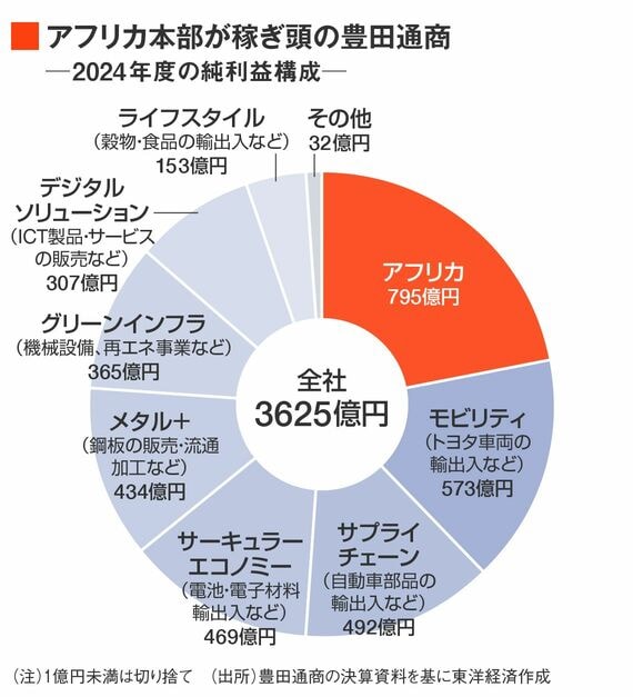 豊田通商が目下、強化するのが「得意科目」のアフリカ事業だ。大手商社では唯一地域別事業本部を設けており、自動車販売を軸に、再生可能エネルギーや医薬品販売をアフリカで行っている。自動車の販売台数では現地企業やほかの外資企業を含め、アフリカでトップシェアを持つ。全社純利益に占めるアフリカ事業の割合は22%と、最大の事業部門になっている。