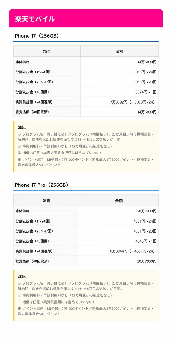 月々の支払いを抑えたい人はソフトバンクの「月額1円」が魅力的に見えるだろう。だが保証料と返却時の費用で結局4万円以上かかる。楽天モバイルのポイント還元も条件が複雑で、受け取り忘れのリスクがある。