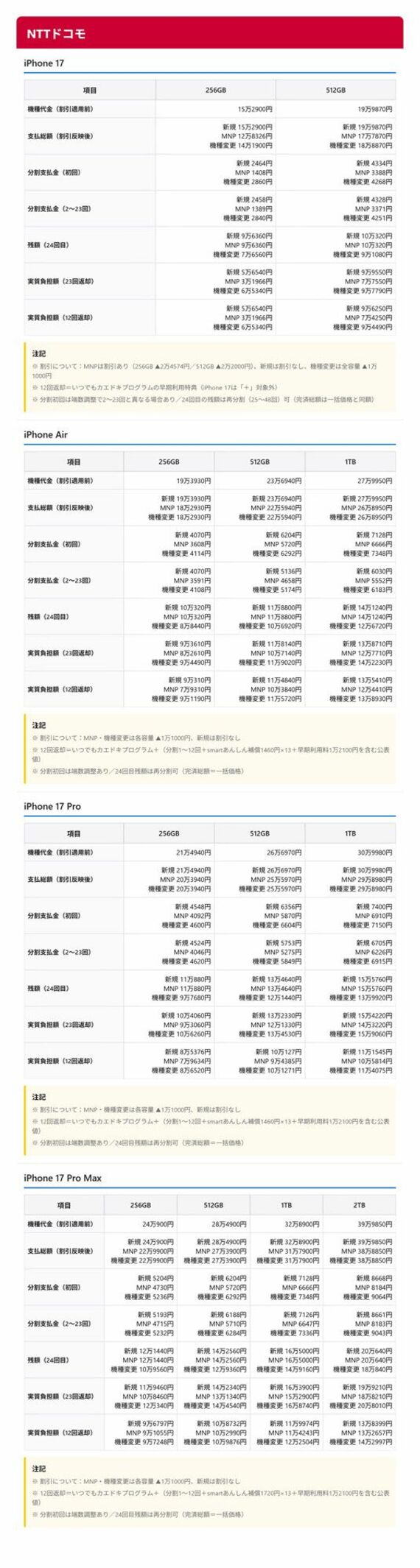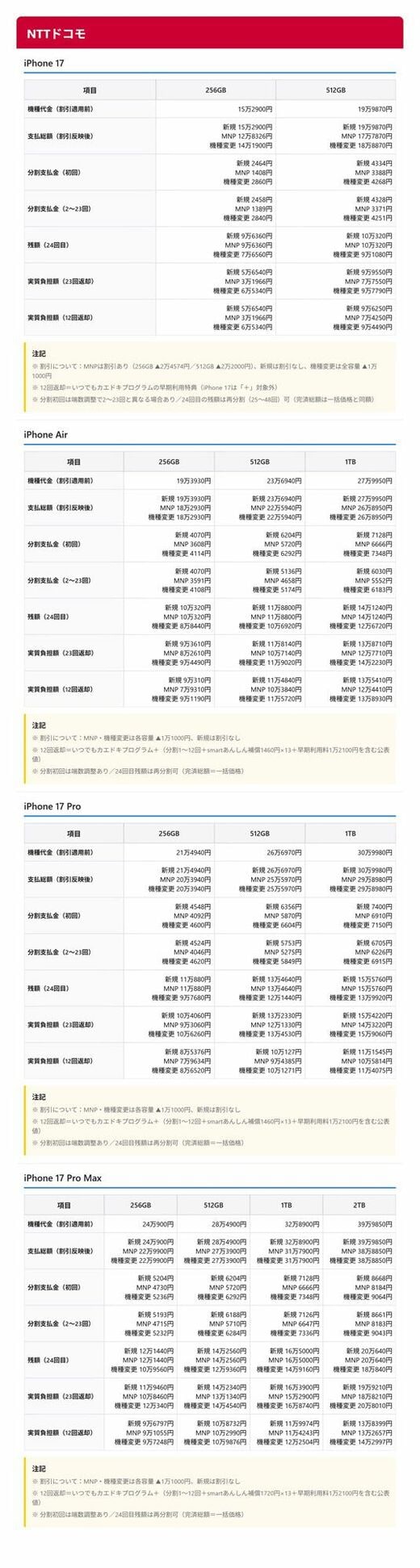 ドコモオンラインショップでのiPhone 17シリーズの価格