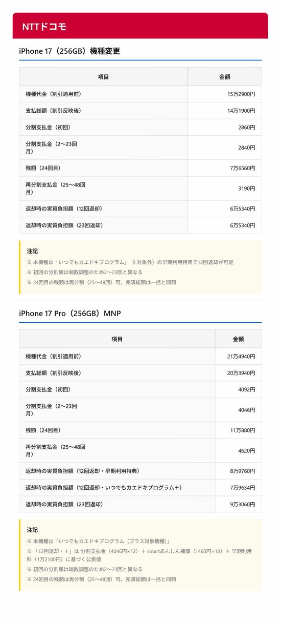 ドコモでiPhone 17と17 Proを購入する場合のシミュレーション