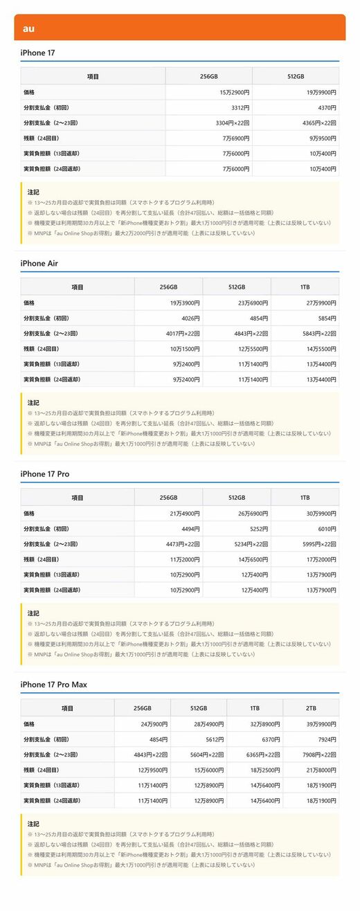 au Online Shopでは他社からの乗り換え時にオンラインショップ限定割引が適用される。iPhone 17が2万2000円、その他機種が1万1000円の割引となる。