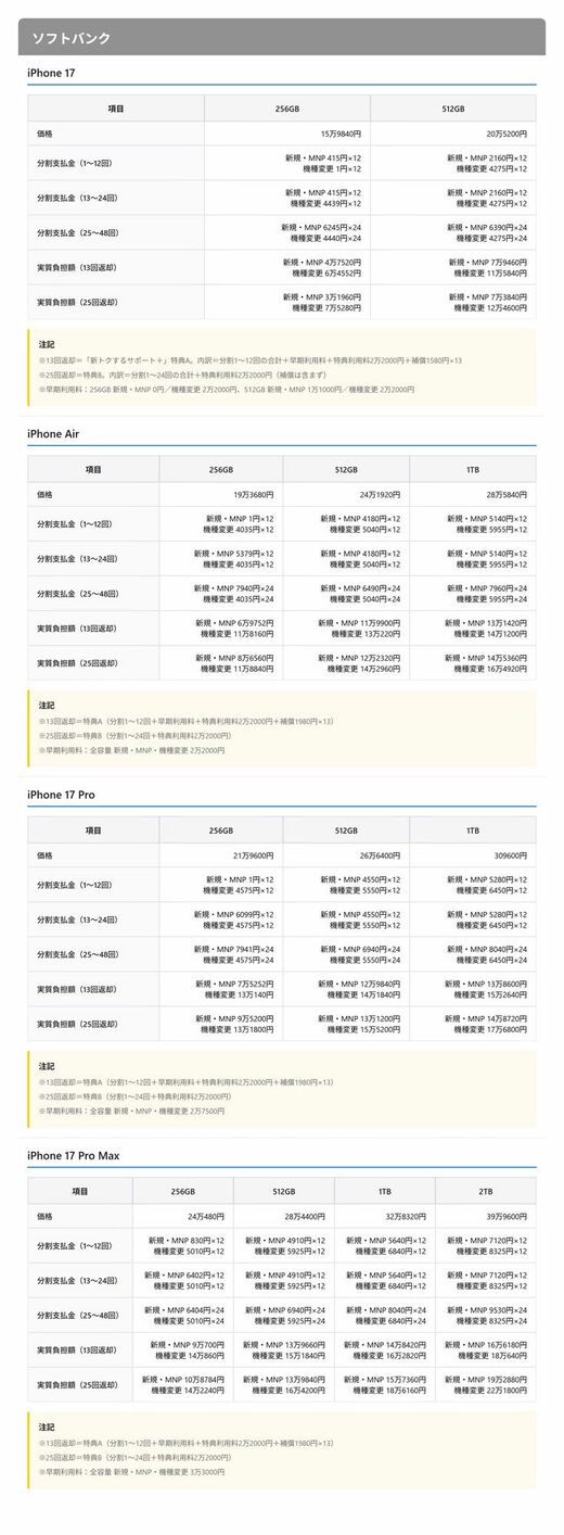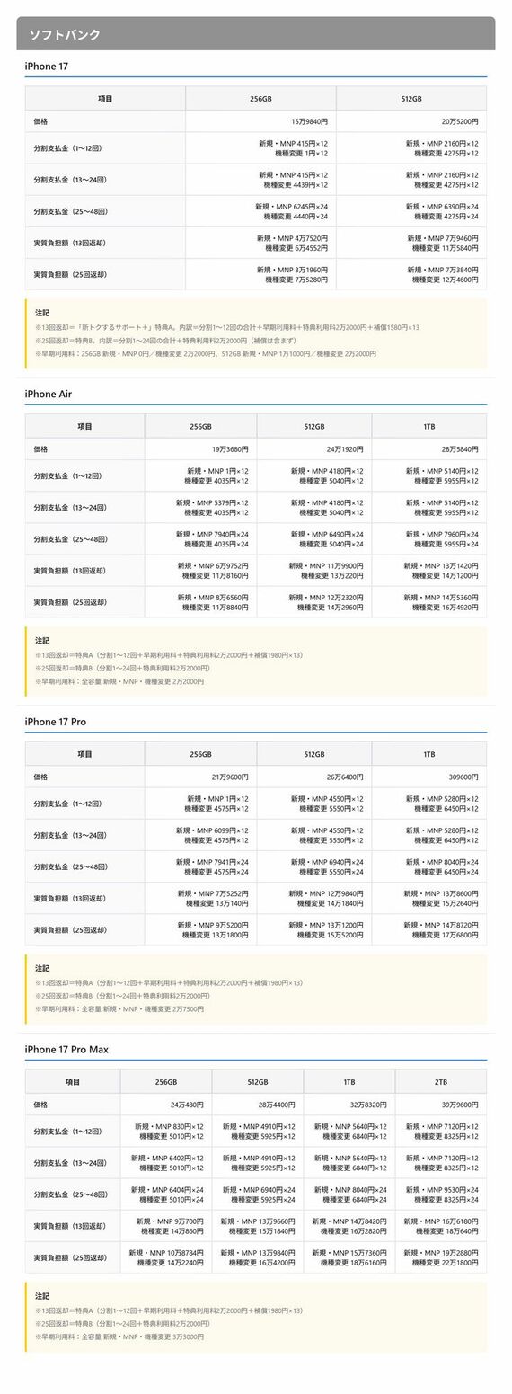 ソフトバンクの料金体系の特徴は、分割支払金の設定にある。iPhone 17(256GB)の場合、機種変更では1〜12カ月目が「月額1円」に設定されている。MNPではオンラインショップ限定割(9936円割引)を併用して同様に「月額1円」を実現している。13〜24カ月目以降は月額4439円となる。