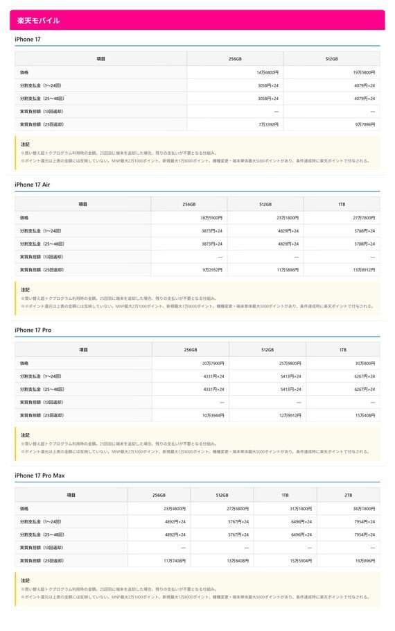 iPhone 17(256GB)の支払い例では、楽天モバイルは12カ月での早期返却プログラムを提供していない。25カ月目に返却する場合、機種代金14万6800円を48回分割で購入し、月々3058円を24回支払う。実質負担額は分割支払金7万3392円となる。残りの24回分(7万3408円)は返却により免除される。