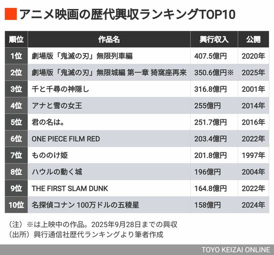 『鬼滅の刃』シリーズ2作のほかに、スタジオジブリ作品、『少年ジャンプ』発の人気漫画のアニメ化作品、新海誠監督作品、人気シリーズの『名探偵コナン』がTOP10のうち9作を占め、唯一の洋画アニメはディズニーの『アナと雪の女王』(255億円/2014年)だ。
