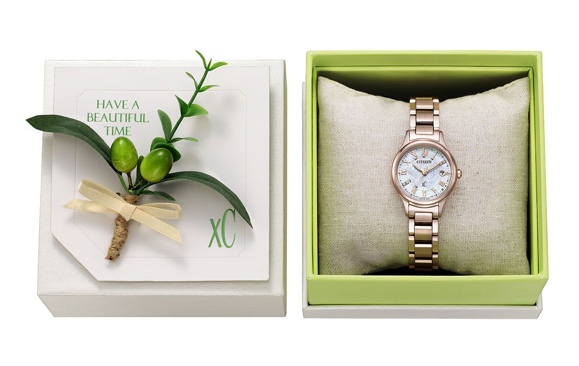 「華美ではないけどきちんと輝いているデザインに仕上がった」と北川さんが語るこのモデルは、裏ぶたに北川景子さんのサインが刻印されており、時計本体はオリーブとユーカリのミニブーケとメッセージカードが入った限定BOXに収められている。