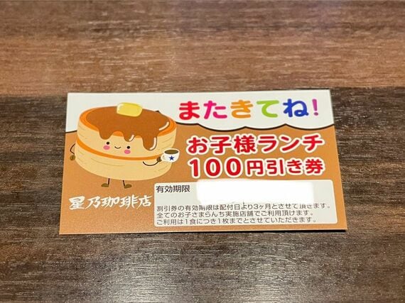 キッズメニューをオーダーすると、もれなく次回から使えるクーポンをもらうことができる。これを使用すればおえかきパンケーキセットは300円だ。また今度、時間の空いたおやつどきに我が子を誘って一緒にカフェタイムを楽しむのも、いい気分転換になりそうだと思いつつ店を後にした。