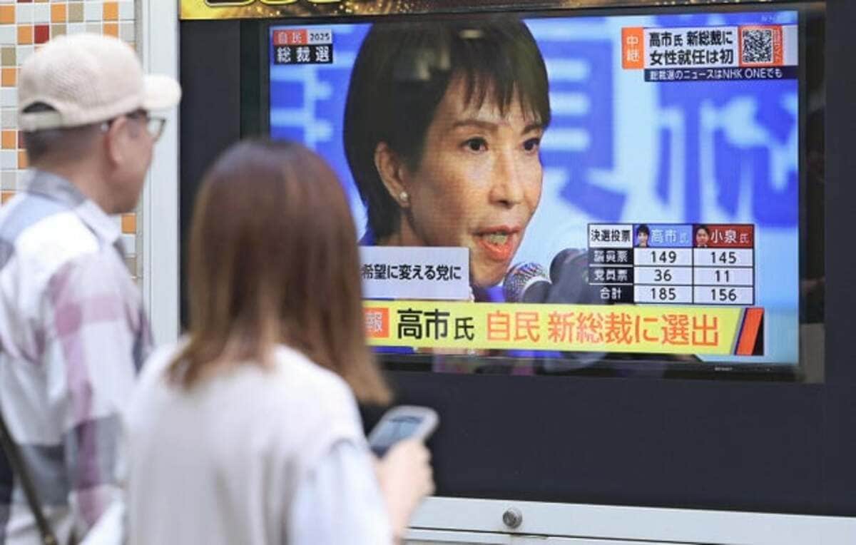 高市新総裁誕生を伝える街頭モニター(4日午後3時4分、東京都内で)=松本祐典撮影