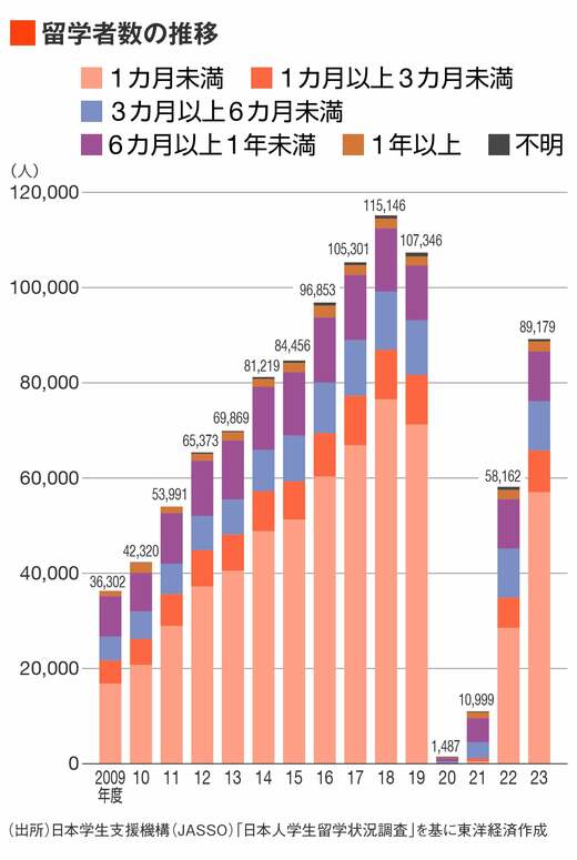 日本学生支援機構(JASSO)の「日本人学生留学状況調査」によると、日本人学生の海外留学者数は増え続け、2018年度には約11万5000人に達した。