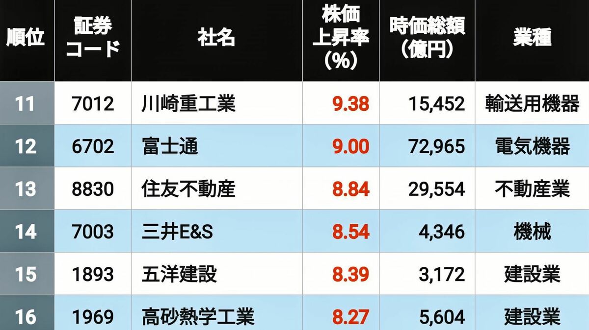 ランキングを概観すると、2桁の上昇率を記録したのが10銘柄、5%以上の値上がりとなったのが48銘柄だった。上位に入った銘柄の業種に注目すると、電気機器や機械、輸送用機器といった輸出関連株が目立った。