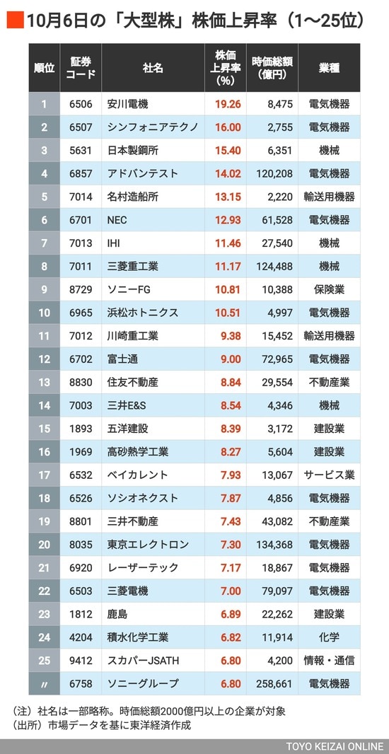 政治・経済・投資 6位NEC、4位アドバンテスト、では1位は? 「高市トレード」で株価が上昇した《大型株》ランキングTOP150 2分で読める 公開日時:2025/10/07 05:00 東洋経済オンライン編集部 フォロー 1/7 PAGES 2/7 PAGES 上昇率10%超は10銘柄 次ページが続きます:【続いて27〜50位】 3/7 PAGES 4/7 PAGES 5/7 PAGES 6/7 PAGES 7/7 PAGES