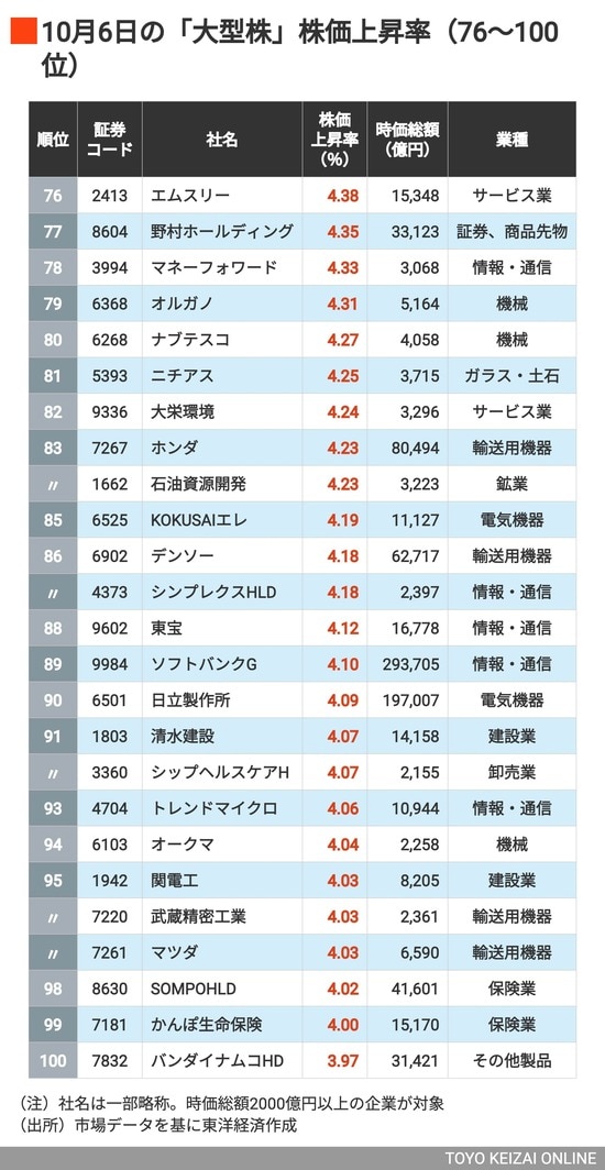 政治・経済・投資 6位NEC、4位アドバンテスト、では1位は? 「高市トレード」で株価が上昇した《大型株》ランキングTOP150 2分で読める 公開日時:2025/10/07 05:00 東洋経済オンライン編集部 フォロー 1/7 PAGES 2/7 PAGES 3/7 PAGES 4/7 PAGES 5/7 PAGES 上昇率4%以上は99銘柄 次ページが続きます:【続いて101〜125位】 6/7 PAGES 7/7 PAGES