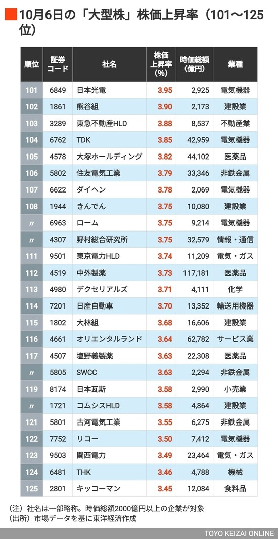 政治・経済・投資 6位NEC、4位アドバンテスト、では1位は? 「高市トレード」で株価が上昇した《大型株》ランキングTOP150 2分で読める 公開日時:2025/10/07 05:00 東洋経済オンライン編集部 フォロー 1/7 PAGES 2/7 PAGES 3/7 PAGES 4/7 PAGES 5/7 PAGES 6/7 PAGES ゼネコンや電力業界にも株高の波 次ページが続きます:【最後は126〜149位】 7/7 PAGES