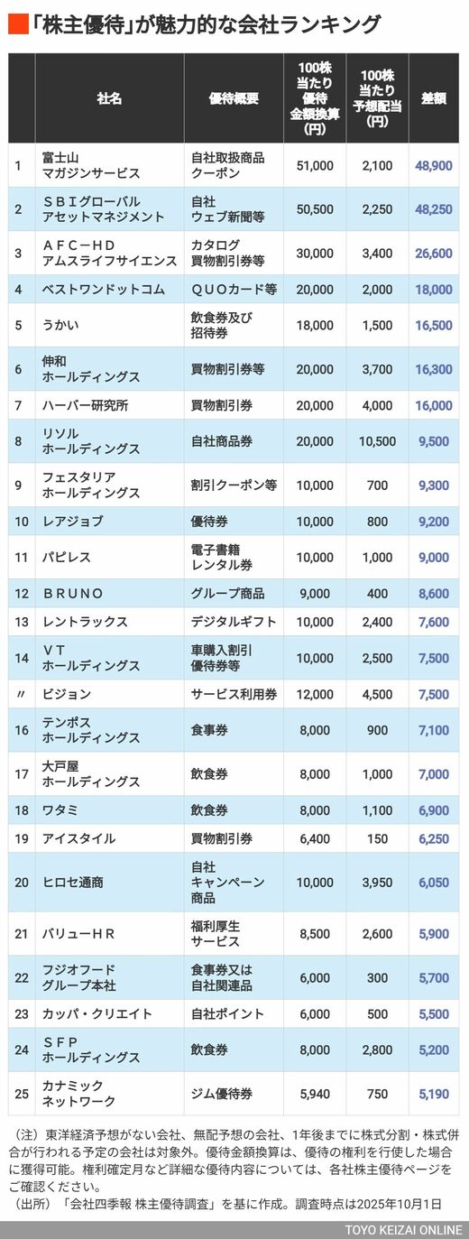 政治・経済・投資 株主優待の「現金換算額」が配当を"上回る"会社ランキング101 予想配当よりも大きい額のQUOカードがもらえる会社も… 2分で読める 公開日時:2025/10/09 05:30 髙尾 楓 東洋経済データ事業局 フォロー 1/5 PAGES 2/5 PAGES 1~25位は? 次ページが続きます:【QUOカードなど金券を配るところも】 3/5 PAGES 4/5 PAGES 5/5 PAGES