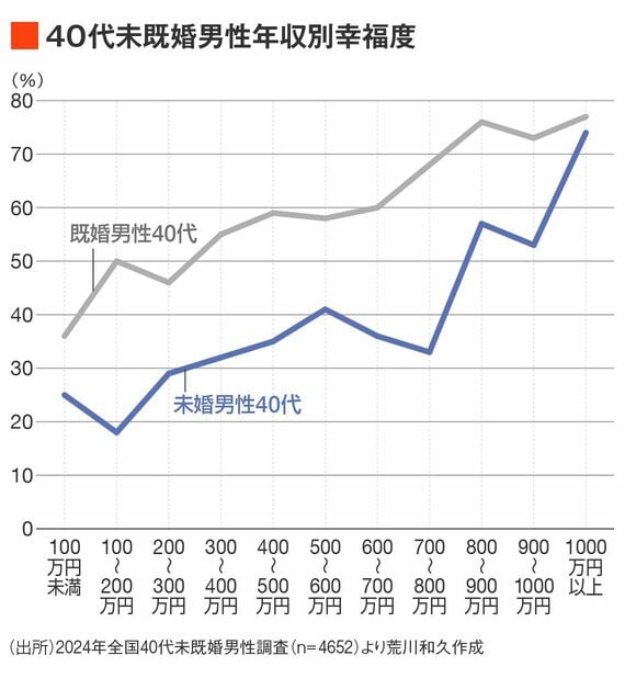 そうは言うものの、たとえば年収と幸福度の相関を見ると、年収が高くなればなるほど幸福度も高まるという正の相関は現実的に存在します。40代未既婚男性に絞って、年収別幸福度の推移を示したものが以下のグラフです。