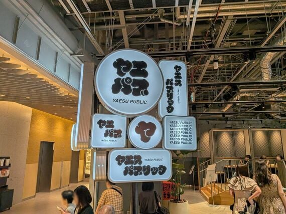 今回のフードコート、ヤエスパブリックは2階にある。公式に「ヤエパブ」という略称があり、フードコートの中にいくつもその略称を記した看板などがある。江戸時代に庶民が使っていたという「江戸文字」のフォントが特徴的だ。