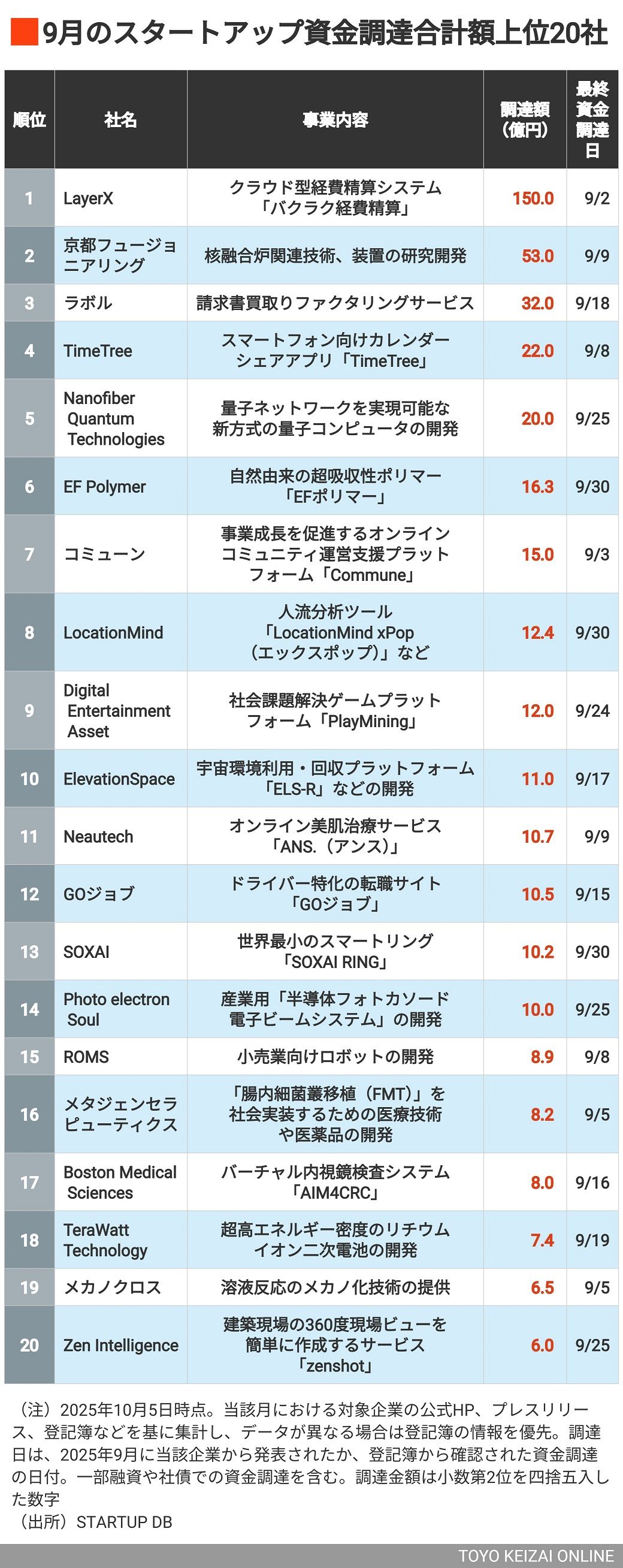 9月の資金調達上位・トップは150億円調達