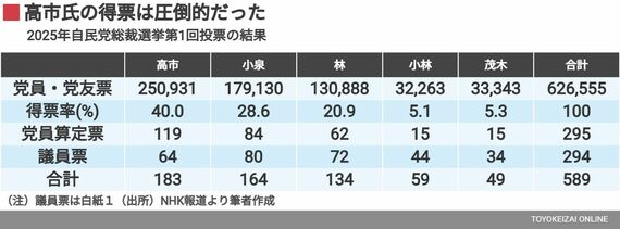 党員・党友票における高市氏の得票率は何と4割。他の候補者を圧倒する高さであった。これがいかにすごいことなのかは、少々補足説明する必要があるだろう。